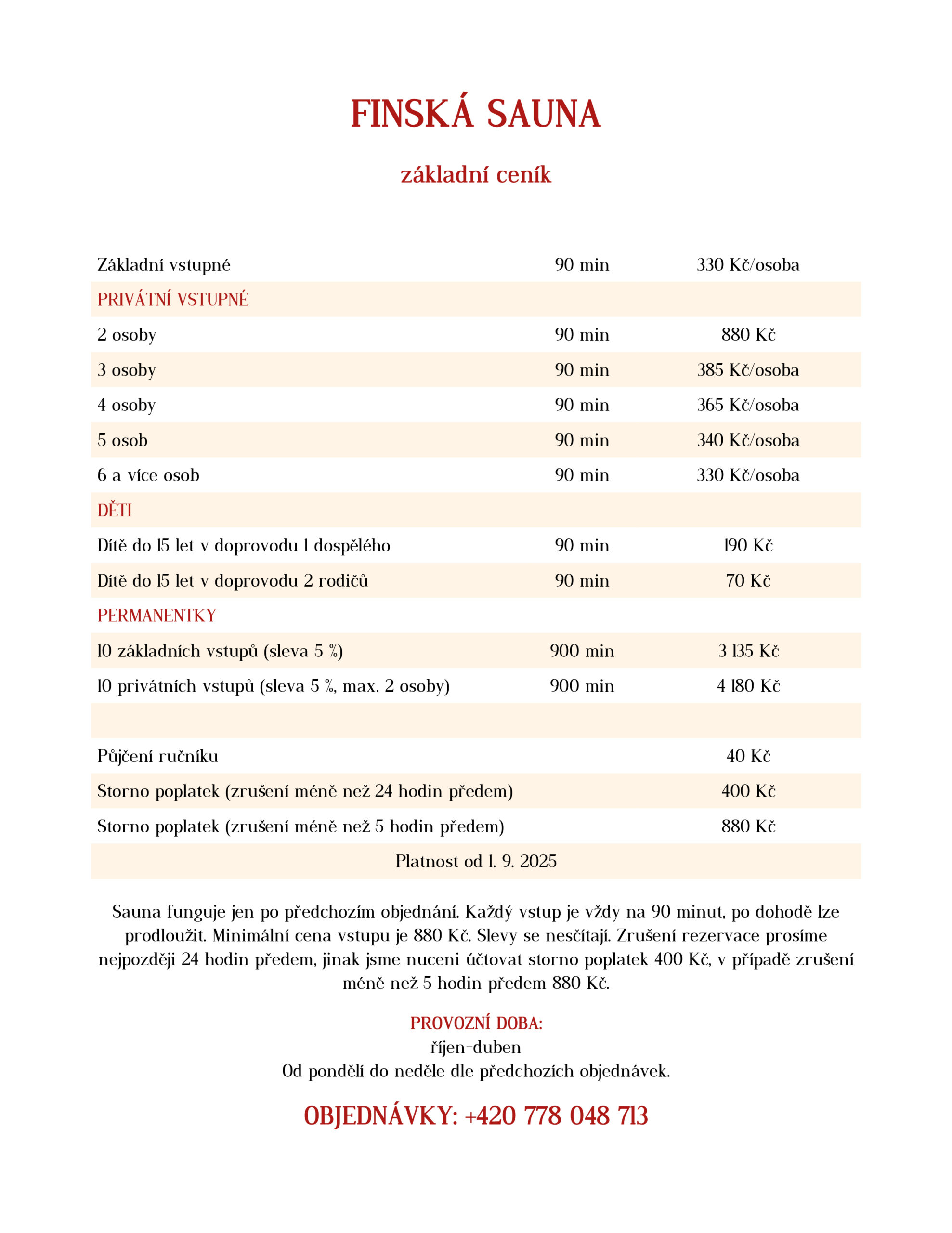 Finskou saunu jsme pro vás otevřeli v roce 2014. Od začátku fungujeme jako soukromá sauna, takže se vždy musíte předem objednat. Saunovací kabina je tak akorát pro 4 osoby, maximální kapacita je 6 osob. Můžete si ale domluvit i početnější skupinu, a zatímco se jedna část saunuje, druhá relaxuje v odpočívárně, nebo na venkovní zahrádce.